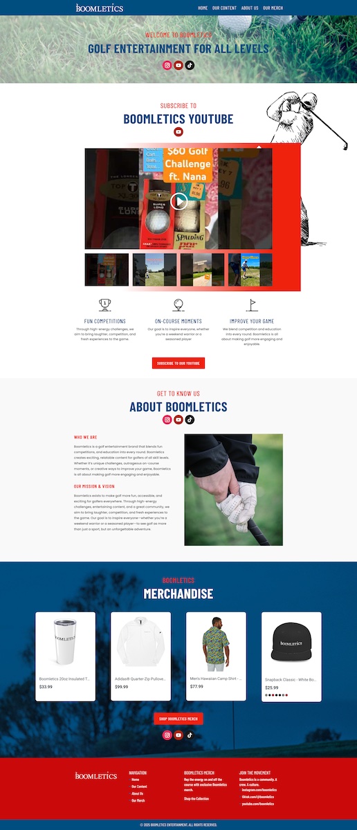 Boomletics, a fast-growing golf entertainment brand, needed a central digital home for their YouTube-driven community. We built their first official website — a sleek, energetic platform that brings together their video content, brand story, and merchandise into one cohesive experience.