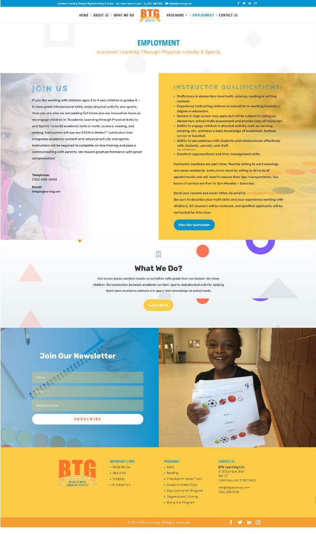 BTG Learning BTG Learning experts train each instructor on our STEM in Motionâ„ curriculum, which uses a unique combination of academics, physical activity, and sports to help your children learn. Visit BTG Learning