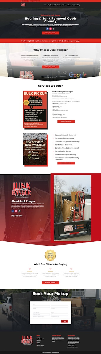 As an up and coming junk removal business entering the Cobb County market, Junk Ranger needed a strong online presence to build credibility and capture leads efficiently. We designed a high-converting landing page that showcases their services, builds trust through testimonials, and guides users directly into a Smart Flow booking form.