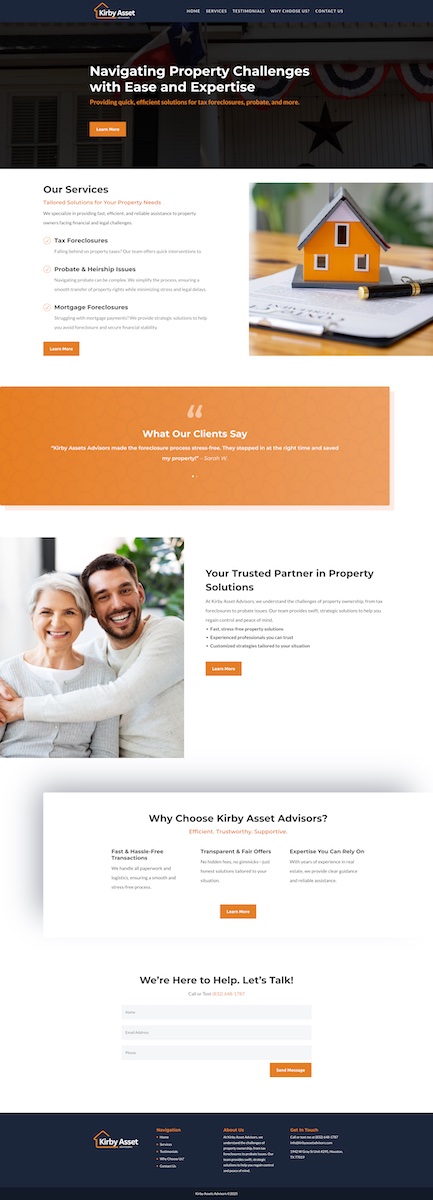 Kirby Asset Advisors needed a focused, conversion-driven landing page to support their advertising campaigns and clearly communicate their real estate services. We built a professional, mobile-optimized page that presents their core offerings — including tax foreclosure assistance, probate support, and mortgage solutions — with clarity and trust-focused messaging.