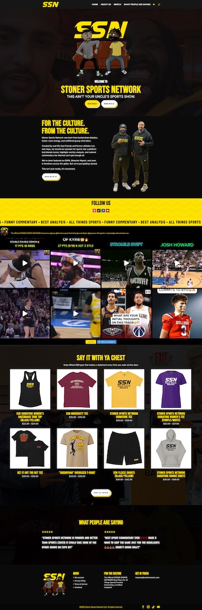 Stoner Sports Network, a fast-growing sports commentary brand with millions of followers across social platforms, needed a central digital hub to unify their brand, content, and community. We built a bold, high-energy website that reflects their culture and connects every touchpoint, from social feeds to merchandise.