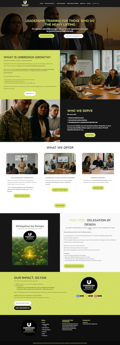 Unbroken Growth, a new leadership development company founded by a retired U.S. Navy Chief, needed a professional website to launch their brand and communicate their unique mission: equipping middle managers and educators with practical leadership tools that last.